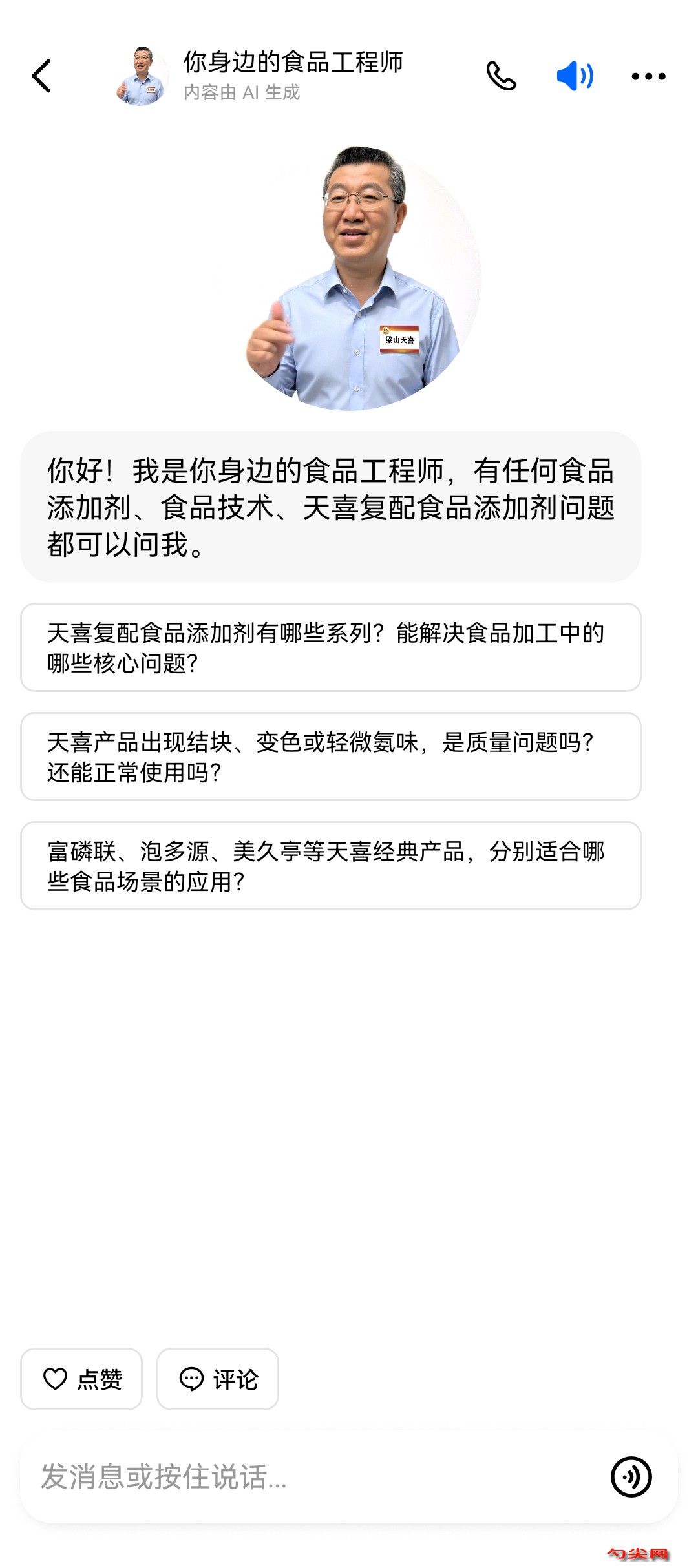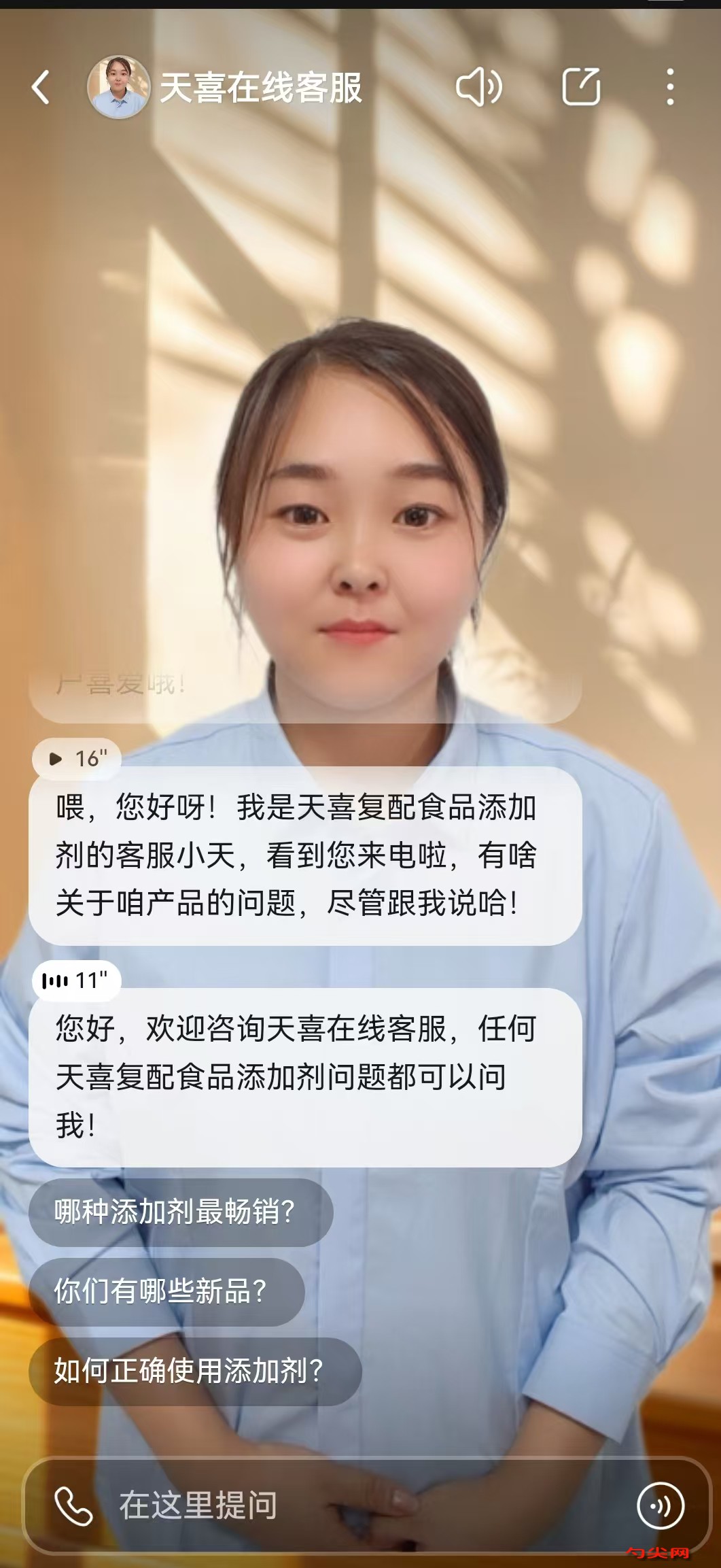 ★★★為了給用戶更及時、快捷、專業的服務體驗,針對天喜產品、食品添加劑、食品技術問題解決,天喜公司打造了文小言【天喜在線客服】智能數字人、豆包【天喜在線客服】、【天喜食品工程師】智能體和納米【天喜在線客服】智能體等多個智能服務數字員工。文小言【天喜在線客服】智能數字人可以為用戶提供24小時在線視頻交流對話,用戶只需點擊以下圖片或鏈接即可開始交流!豆包【天喜在線客服】智能體和納米【天喜在線客服】智能體不僅可以開展天喜售前、售中、售后咨詢,還能為用戶提供[在線觀看食品新技術短視頻]鏈接、[更多相關食品技術經驗分享]鏈接等服務,同時還能提供食品技術分析、食品配方工藝設計、食品安全知識問答等免費服務。