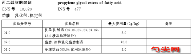 用作乳化劑、消泡劑、穩(wěn)定劑,作為乳化劑HLB值小,乳化活性不強(qiáng),很少單用,常與單雙甘油酯等其他乳化劑配合使用,起增效作用。但丙二醇脂肪酸酯有一個(gè)特性就是它具有α-晶型傾向性,并能使其他乳化劑(如單甘酯)的α-晶型穩(wěn)定,從而使得單甘酯保持或延緩α-晶型向β-晶型轉(zhuǎn)換,使之具有良好的乳化穩(wěn)定性能??捎糜谌嗽炷逃停乐顾蛛x及水飛濺。用于起酥油,能防止面包、西點(diǎn)等老化,改善其制造過程。用于冰淇淋可以提高膨脹性和保型性。具有很好充氣能力,形成輕而穩(wěn)定的泡沫,因而在酥蛋面包、干酪面包和蛋糕裱花奶油等食品中具有廣闊的市場(chǎng)。我國GB2760-2014規(guī)定用于乳及乳制品(01.01.01、01.01.02、13.0涉及品種除外)、脂肪,油和乳化脂肪制品、冷凍飲品(03.04食用冰除外)、熟制堅(jiān)果與籽類(僅限油炸堅(jiān)果與籽類)、油炸面制品、糕點(diǎn)、復(fù)合調(diào)味料、膨化食品,最大使用量20g/kg 。