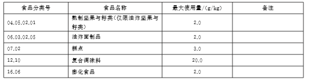 在脂肪、油和乳化脂肪制品最大用量為10.0g/Kg,在乳及乳制品、冷凍飲品最大用量為5.0g/Kg,復(fù)合調(diào)味料20g/kg糕點(diǎn)、膨化食品、熟制堅(jiān)果與籽類和油炸小食品最大用量為2.0g/Kg。