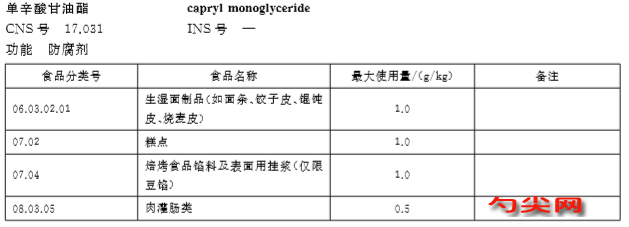 單辛酸甘油酯為食品添加劑是以辛酸、甘油為原料進行酯化反應后經精制制得的,分子式為C11H22O4,相對分子質量為218.29(按2011年國際相對原子質量),中華人民共和國衛生部就食品添加劑過氧化鈣于2016年8月31日發布了食品安全國家標準,現行標準號為 GB 1886.57-2016 ,自2017年1月1日起開始實施。