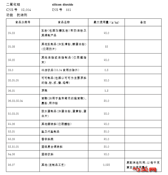 食品工業用作抗結劑、消泡劑、增稠劑、助濾劑、澄清劑。我國《食品添加劑使用衛生標準》(GB2760-2011)規定:可用于蛋粉、糖粉、奶粉、可可粉、可可脂、植物性粉末、速溶咖啡、湯料粉等,最大使用量為15g/kg,粉末香精,最大使用量為80g/kg;固體飲料,最大使用量為0.2g/kg;糧食,1.2g/kg。