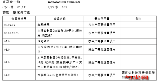 果醬和果凍、橘皮果凍3g/kg(單用或與富馬酸、酒石酸及其鹽類合用量);pH值保持劑(使pH值保持在2.8~3.5)。