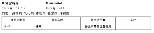 2. FDA(21CFR §180.25):薄荷糖98%;硬糖5%;止咳糖5%;膠姆糖31%;軟糖40%;蜜餞和冰霜8%;未標準化果醬和果凍15%;其他食品2.5%。
