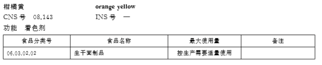 【用途】:面包、餅干、糕點(diǎn)、糖果、果汁(味)飲料等的著色,為黃色著色劑。該產(chǎn)品企業(yè)標(biāo)準(zhǔn)文號(hào)為:Q/KLE22-2005。