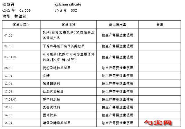 使用:按照《食品安全國家標準 食品添加劑使用標準》(GB 2760——2014)規定,硅酸鈣作為抗結劑可用于乳粉(包括加糖乳粉)和奶油粉及調制產品,干酪和再制干酪及其類似品,可可制品(包括以可可為主要原料的脂、粉、漿、醬、餡等),淀粉以及淀粉類制品,食糖,餐桌甜味料,鹽及代鹽制品,香辛料及粉,復合調味料,固體飲料,酵母及酵母類制品,最大使用量按照生產需要適量使用。FAO/WHO規定,硅酸鈣用于干燥乳清粉及乳清制品的最大使用量為10 g/kg,用于糖粉和葡萄糖粉的最大使用量為15 g/kg,用于鹽及代鹽制品最大使用量為按照生產需要適量添加。FDA規定該產品可用于餐桌用鹽及各種食品的抗結劑(最大添加量不超過食品質量的2%)用于發酵粉最大添加量不超過食品質量的5%。