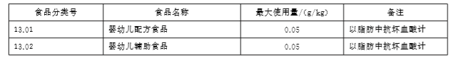 2.幼兒配方食品,學齡前兒童配方食品:按油脂中抗壞血酸計,添加量不超過0.05g/kg;