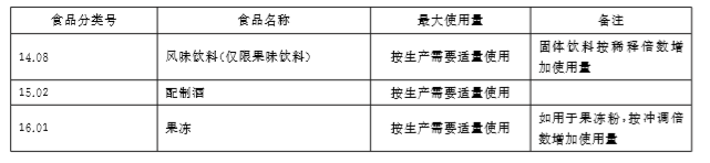 ①我國《食品添加劑使用衛生標準》(GB2760-2011)規定:可按生產需要適量用于果味型飲料、糖果、配制酒、果醬、調味類罐頭、蜜餞、糕點上彩裝、糕點、冰棍、雪糕、果凍。