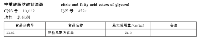 檸檬酸脂肪酸甘油酯是一種非離子型食品乳化劑,它是由甘油與脂肪酸和檸檬酸酯化的產物,HLB值4-6,具有乳化、分散、螯合、抗氧化增效、抗淀粉老化及控制脂肪凝集等作用,。GB2760-2007批準該產品為:可在“各類食品中按生產需要適量添加”;可廣泛應用于油炸薯片、烘焙產品、肉制品、乳化脂肪制品、嬰兒配方食品、較大嬰兒和幼兒配方食品以及糖廠煮糖的防垢等。