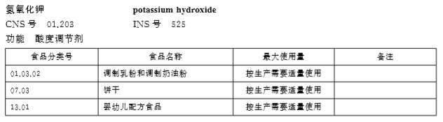 FAO/WHO(1984):配制嬰兒食品、速凍法式油炸土豆、食用酪蛋白酸鹽,GMP;可可粉及含糖可可粉、可可豆粉、可可液塊及可可油餅,5g/kg(以無脂可可及K2CO3計)。
