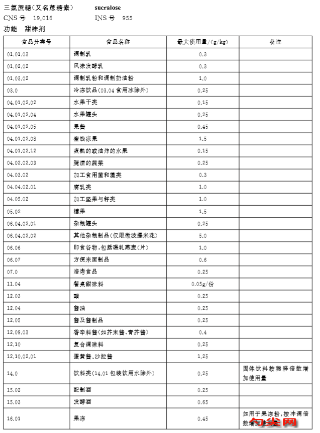 我國《食品添加劑衛生標準》(GB2760-2014)規定三氯蔗糖可用于餐桌甜味劑,最大使用量為0.05g/包、片;冷凍飲品(03.04食用冰除外)、水果罐頭、腌漬的蔬菜、雜糧罐頭、焙烤食品、用于果汁(味)型飲料、復合調味料、配制酒、醬及醬制品、醋、醬油中,最大使用量為0.25g/kg;用于調制乳、風味發酵乳、加工食用菌和藻類中,最大使用量為0.3g/kg;用于香辛料醬(如芥末醬、青芥醬)中,最大使用量為0.4g/kg;用于果醬類、果凍類食品中,最大使用量為0.45g/kg;用于發酵酒中,最大使用量為0.65g/kg;用于調制乳粉和調制奶油粉中,最大使用量為1g/kg;用于蛋黃醬、沙拉醬中,最大使用量為1.25g/kg;用于、蜜餞、糖果中,最大使用量為1.5g/kg 。