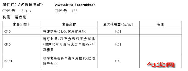 用途與注意事項: 食用紅色素。我國《食品添加劑使用衛生標準》(GB2760―1996)中規定:可用于糖果(包括巧克力和巧克力制品)、冰淇淋、雪糕和冰棍,最大使用量為0.05g/kg。