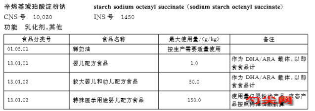 辛烯基琥珀酸淀粉鈉可作為乳化劑,用于嬰兒配方食品,最大使用量1.0g/kg;用于較大嬰兒和幼兒配方食品,最大使用量50.0g/kg,作為DHA/ARA載體,以即食食品計;用于特殊醫(yī)學(xué)用途嬰兒配方食品,最大使用量1.0g/kg,使用量僅限粉狀產(chǎn)品,液態(tài)產(chǎn)品按照稀釋倍數(shù)折算。還可作為防黏劑,用于膠基糖果加工工藝 。
