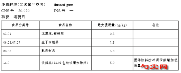 GB 2760-2011《食品安全國家標(biāo)準(zhǔn)食品添加劑使用標(biāo)準(zhǔn)》規(guī)定,亞麻籽膠在各類食品中按生產(chǎn)需要適量使用,及下表所示。