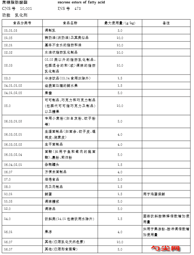乳化劑,亦可作保鮮劑。高品質的蔗糖脂肪酸酯無臭無味無毒,是一種良好的食品乳化劑。用于肉制品、乳化香精、水果及雞蛋保鮮、糖果等。根據我國《食品添加劑食用衛生標準》(GB2760-1996)中規定:蔗糖脂肪酸酯可用于肉制品、香腸、乳化香精、水果及雞蛋保鮮、冰淇淋、糖果、面包,1.5g/kg;乳化天然色素,10.0g/kg 。