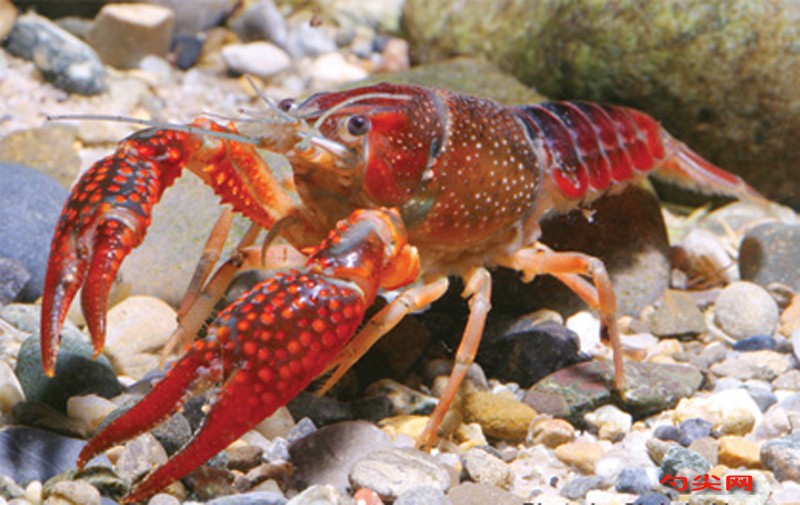 小龍蝦(學名:Procambarus clarkii):也稱克氏原螯蝦、紅螯蝦和淡水小龍蝦。形似蝦而甲殼堅硬。成體長約5.6~11.9厘米,暗紅色,甲殼部分近黑色,腹部背面有一楔形條紋。幼蝦體為均勻的灰色,有時具黑色波紋。螯狹長。甲殼中部不被網眼狀空隙分隔,甲殼上明顯具顆粒。額劍具側棘或額劍端部具刻痕。