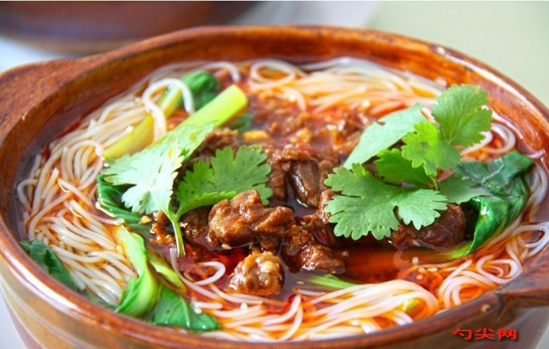 著名的米線當(dāng)推過橋米線。過橋米線起源于云南蒙自有100多年的歷史。其特殊的地方在于肉湯和佐料肉湯含有一層厚厚的雞油用于保溫。肉湯溫度接近滾燙但雞油阻止了蒸汽的揮發(fā)所以外觀看不出其滾燙來。吃的時候現(xiàn)把切得極薄的豬瘦肉片和打開的生鵪鶉蛋放入肉湯用筷子稍微攪拌使生食充分燙熟。然后把米線撥入肉湯加入上述的其他佐料拌勻食用