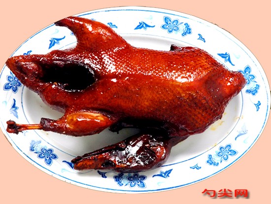 4.將鹵熟的鴨子撈起控干水分,再放入油鍋中,炸至皮酥且呈棕紅色時撈出,刷上飴糖即成。