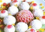 雙味珍珠元子的制作過程是:糯米洗凈用水浸泡(時間冬長夏短),取400克,趁熱加入蛋液及生坯冷卻;棗泥餡分擠搓圓,雞肉制成顆粒,紅腸、生姜、冬筍切成小顆粒,下鍋炒成三鮮餡,加蔥花冷即糯米坯分別包入甜咸餡沾裹剩余的泡米,上籠蒸熟(5分鐘),出籠,包甜餡的再均勻地沾上椰絲。裝盤美飾。