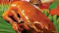 3.制坯:把用竹片做的一頭為叉形,一頭為平形的小竹撐子放入鴨坯體腔內(nèi),將叉形一頭撐在背脊骨上,平頭撐在胸脯上,使鴨胸挺起,以便在烤制時(shí)不致肩縮。然后用鉤掛住鴨頭,放入100℃的沸水內(nèi)燙皮。先燙頭頸部,再燙全身,使鴨皮伸展,體形美觀。燙好后將鴨頭向上掛起,用毛巾擦干鴨身,再在鴨體表面均勻地涂抹一層飴糖,掛起晾干。