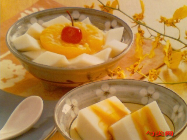 (3)食用時,將豆腐用刀劃成菱形狀,大湯碗內放入冷凍糖水及香蕉精,將杏仁豆腐推入糖水內,放入桔子、櫻桃即成。