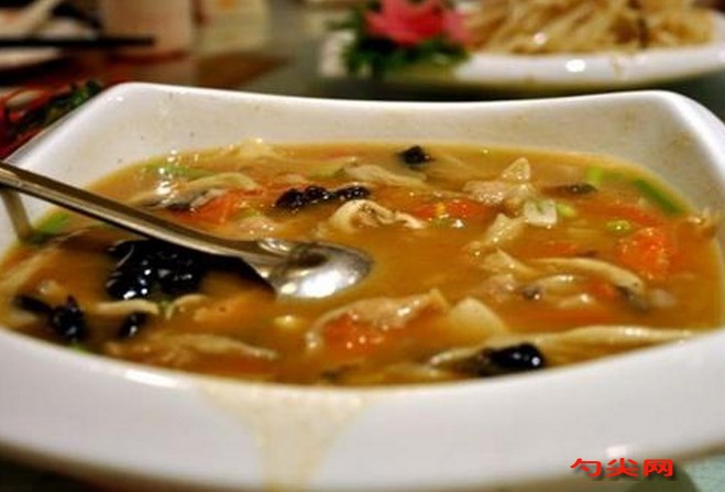 用料: 豬里脊肉、200g蒜苗(蒜薹)100g、平菇100g、西紅柿1只(約150g)青豆、少許(約50g)、干黃花菜少許(約15g)、干木耳 少許(約15g)、香菜2根、蛋清1只、水淀粉2湯匙(30ml)、白胡椒粉2茶匙(10g)、香醋1湯匙(15ml)、鹽1茶匙(5g)、雞精1/2茶匙(3g)、油200ml(實耗15ml)、高湯(或水)1000-1200ml做法: 步驟一:干黃花菜和干木耳用溫水充分泡發,洗凈后瀝干水分備用。蒜苗(蒜薹)切成3cm 長的小段。西紅柿切成片狀。平菇手撕成細條。香菜切碎。豬里脊肉切成3mm 厚的片狀,加入水淀粉1湯匙(15ml)和蛋清,用手抓勻。 步驟二:中火加熱炒鍋中的油,在油溫稍熱時,將抓勻的豬里脊肉放入溫油中滑一下,先用筷子輕撥,再立即撈出瀝干油分。 步驟三:炒鍋中留少許底油,中火加熱后分別放入蒜苗(蒜薹)段、平菇條和西紅柿片翻炒,調入鹽。 步驟四:在鍋內加入高湯(或水),改大火將湯煮沸,再分別放入青豆、泡發的黃花菜、泡發的木耳和油滑過的里脊肉片。 步驟五:等湯汁再次煮沸,用剩余的水淀粉1湯匙(15ml)勾薄芡。并調入白胡椒粉、香醋和雞精。上桌前撒上香菜碎即可。