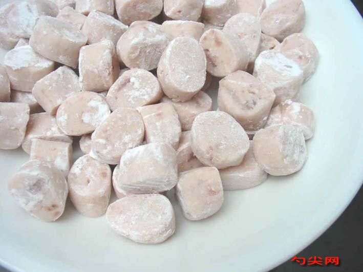 3.成型、切塊:將炒糯米粉面團(tuán)放在案板上,為防止散熱影響制品質(zhì)量和成型,要采取保溫措施趁熱成型。先分塊搟成厚1厘米左右的面片,切成1厘米左右寬的細(xì)條,搓成圓柱形,再切成1厘米長的顆粒塊狀、拌上綿白糖,冷卻即成。