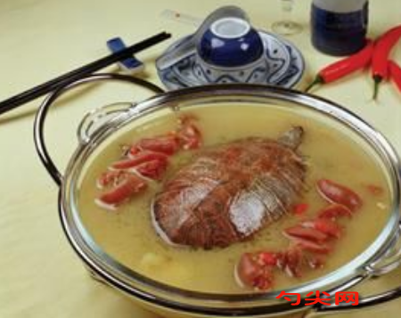 3 . 茶 籽 油 燒 至 八 成 熱 , 將 龜 肉 、 羊 肉 、 姜 片 、 精 鹽 下 鍋 , 爆 炒 加 入 紹 酒 、 桂 皮 和 豬 骨 清 湯 , 再 燉 至 羊 肉 熱 爛 ; 將 蒸 好