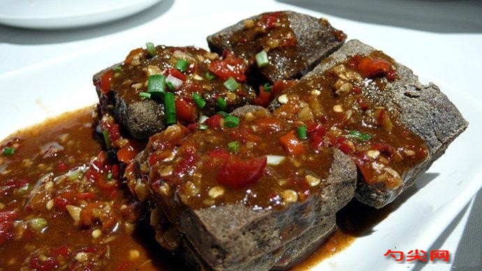 因為鹵水中放有鮮冬筍、瀏陽豆豉、香菇、上等白酒等多種上乘原料,故味道特別鮮香。 湖南臭豆腐: 油炸"臭豆腐"聞著臭吃著奇香,是中國小吃一絕。"臭豆腐"各地皆有,而湖南長沙"火宮殿"的油炸"臭豆腐"卻更有名氣。據說,50年代,有名人去湖南搜集民間資料,曾來過以"臭豆腐"聞名當地的"火宮殿"。這里的臭豆腐,系用文火炸焦后,再將一塊一塊的豆腐鉆孔,灌辣椒油。吃起來辣味十足,臭香濃郁,頗受贊賞,也因此,"火宮殿"的臭豆腐的名聲傳出了湘地,傳遍了大江南北。 先用黃豆,豆立固A等制成豆腐片(白豆腐),再醞釀制鹵水,用黑豆豉煮沸,冷卻后加香菇、冬筍、白酒等佐料,浸泡15分鐘。炸要炸透,表面炸焦,里面卻是白白嫩嫩的。淋辣椒漿吃。