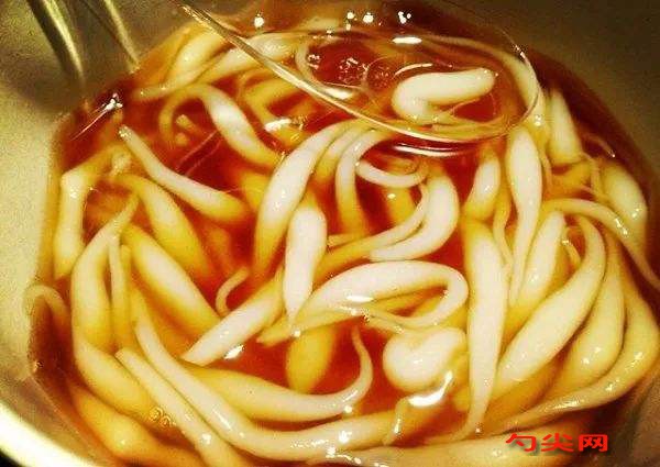 工藝:稱取200克豌豆粉,加入2克筋力源Q,干拌均勻。加入320克清水,用攪拌器高速攪拌溶解,然后靜止50-120分鐘。鍋中加入700克水,加熱到微微沸騰時,倒入靜止好的淀粉糊,邊倒邊攪拌。開小火不停攪拌,繼續熬至淀粉糊變成透明狀。將熬好的淀粉糊倒入磨具,漏入涼水中,就變成涼蝦啦。做好的涼蝦可以搭配紅糖水、水果等一起食用。