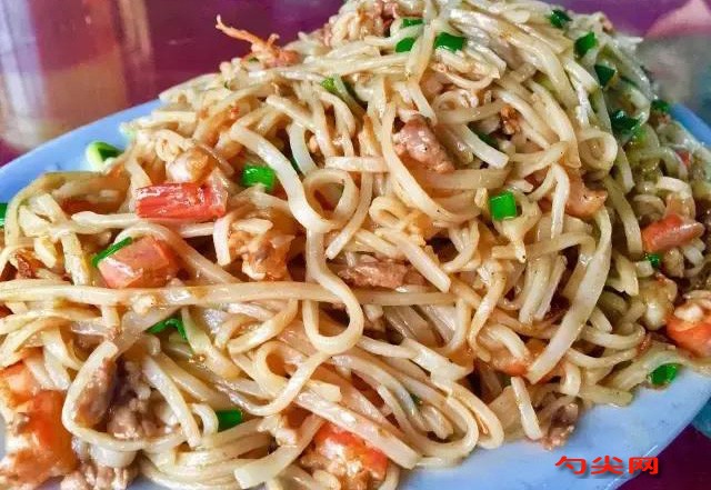 注意事項:選擇優質大米作為原料,精心加工成白米后浸泡,并磨成細膩米漿,可以適當添加食用礬水增加粉皮的軟韌嫩滑度。選用竹子制成的方形蒸具,鋪好蒸布并刷上食用油以防粘連。鋪漿時要均勻且薄,確保受熱均勻。蒸粉皮時,需用猛火,并掌握好火候。蒸制時間不宜過長,當面層起泡時即可取出,避免粉皮過熟粘成一團或未熟過硬。蒸好的粉皮要馬上拿出剝落散熱,折疊切成寬絲條狀備用。