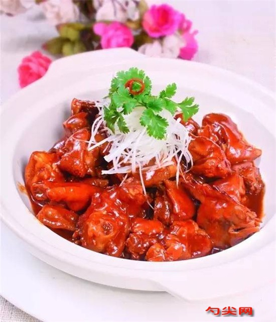 工藝:笨雞宰殺治凈,剁成小塊。豬蹄刮洗干凈,剁成小塊,沖掉血水之后冷水下鍋焯透。鍋下底油燒熱,加入黃豆豆瓣醬170克、韓國(guó)辣醬100克、蠔油80克、老抽50克小火翻炒均勻,加入高湯15千克,調(diào)入適量鹽、白糖,味達(dá)蕾901#依次放入豬蹄5千克、雞塊4千克(豬蹄在下、雞塊在上),中火燒開(kāi)之后轉(zhuǎn)小火燜50分鐘。取豬蹄、雞塊共450克以及適量原湯入鍋,開(kāi)大火收至湯濃,淋明油后出鍋裝盤(pán)即可。醬香微辣。