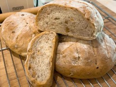 工藝: 1.把高筋面粉、全麥面粉、酵母、 佳多美Q 和水混合,攪拌成團(tuán)以后再加入鹽,揉至面團(tuán)光滑,再加入軟化的黃油,揉至面筋擴(kuò)展階段(展開后能抻出均勻的薄膜)。然后再加入核桃碎和勻。 2.容器上蓋上保鮮膜,讓面團(tuán)在室溫下發(fā)酵至兩倍大。 3.將面團(tuán)平均分成四份,整型好之后蓋上濕的布,醒發(fā)15分鐘。 4.給面團(tuán)表面噴上點(diǎn)水,烤箱里放一盤熱水增加蒸汽(如果烤箱有蒸汽功能就可以用烤箱本身的蒸汽),40度左右發(fā)酵一小時(shí)二十分鐘,至原來(lái)的至少兩倍大。5.給面團(tuán)表面撒上面粉,割出好看的紋路(建議用刀片或者手術(shù)刀,但是建議平時(shí)收藏好,不要給小朋友拿到)。 6.烤箱200度預(yù)熱好,放入烤箱烤30分鐘,至表面金黃出爐。放涼以后刷去浮粉,就可以切片享用了。