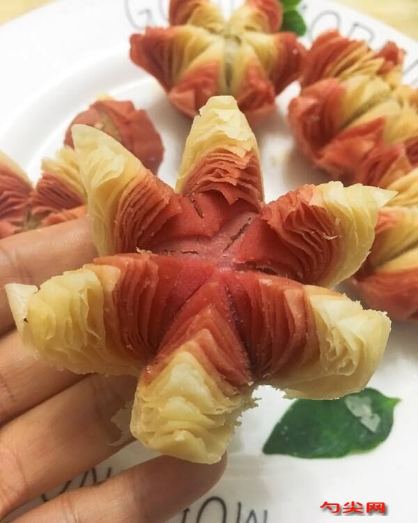 工藝:制皮糕點(diǎn)粉與面欣酥E置于臺(tái)板上干拌均勻開塘,加豬油和水,揉和均勻。制酥糕點(diǎn)粉和豬油擦成油酥即可。成型將皮面和油酥面制成酥皮面,分成20塊,搟成28cm×17cm的薄皮,用刀切成5.5cm見方的皮,包入餡心料10g、封口捏緊朝下,再用刀片在頂部切三刀,做出六瓣葉子即為生坯。成型時(shí),皮不能太薄,以免翻不出層論;開刀時(shí)則不能露餡。炸制將生坯放入鋁盤,入油鍋炸制,使各坯花朵同時(shí)開放。外酥皮層層翻出,形如花瓣,色澤雪白,香甜酥松。