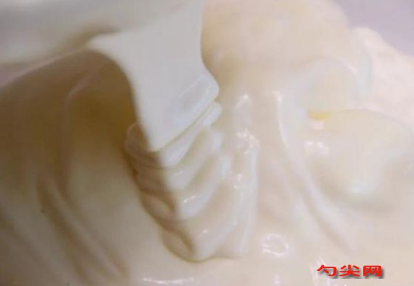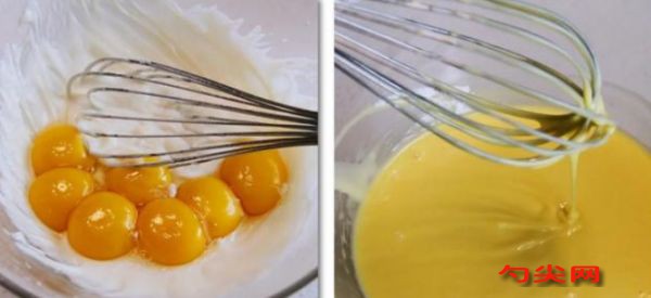 6.之所以混合第一與1/3蛋白粘貼用蛋黃,該蛋黃為了稀釋,以使蛋黃蛋白粘貼更容易混合,混合時(shí)間是短暫的。因?yàn)槲覀內(nèi)绻粋€(gè)長(zhǎng)時(shí)間攪拌時(shí)間或者通過(guò)攪拌太用力,會(huì)導(dǎo)致蛋糕糊消泡,這樣烤出來(lái)的蛋糕體積就會(huì)不斷縮小。
