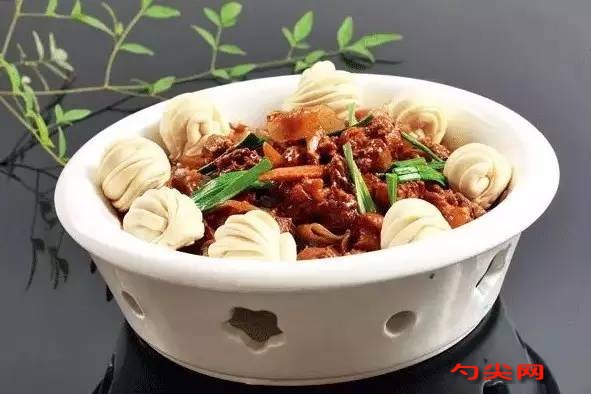 工藝:將土雞用刀砍成小塊;干粉皮用水泡好。鍋內(nèi)加熟豬油燒熱,爆香辣椒醬和蔥、姜、蒜,然后再下入雞塊炒至變色,加入二湯和A料(干辣椒、八角、桂皮、花椒各10克),雞粉8克,生粉50克,辣椒醬12克,熟豬油30克,二湯1千克,味達蕾901#4克,放入高壓鍋內(nèi)壓制20分鐘。鍋內(nèi)倒入壓好的雞塊,然后再放入泡好的粉皮,用大火收汁,最后出鍋,下入蒜苗,裝盤時圍上用不粘鍋煎好的小花卷。