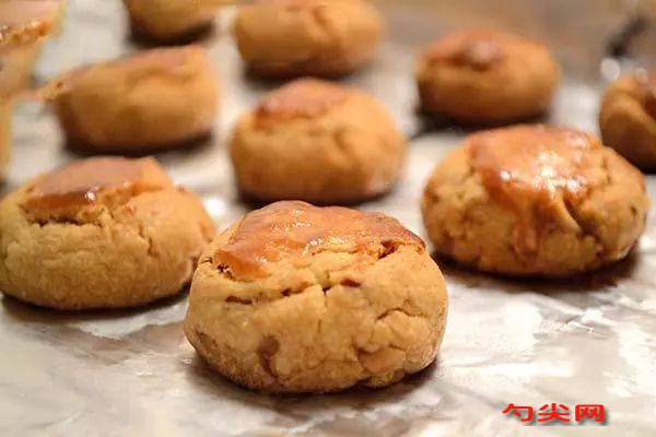 工藝:將120克花生米加入1克舒欣脆F和200克清水,浸泡一個小時。舒欣脆F可以使花生酥膨松飽滿、口感酥脆、口溶性好。將浸泡好的花生米放入預熱好的烤箱,150度烤十分鐘??臼旌笕テぃ脫{杖輕輕敲打碾碎。碗中打入兩個雞蛋,加入100克白砂糖和150克食用油,用筷子攪拌均勻。然后分次倒入400克低筋面粉和4克面欣酥B,繼續攪拌。面欣酥B可使花生酥膨松個大、口感酥脆、口溶性好、形狀飽滿。將1克用涼開水溶解好的美久亭Q加入面糊中,以防止花生酥腐敗變質,延長保存期。將碾碎的花生碎倒入面糊中,用鏟子輕輕翻拌均勻。取一小塊面糊放在手上,團圓后輕輕壓扁,大約15克一個,放入烤盤中。在面團表面刷上一層蛋黃液,撒上黑白芝麻??鞠涮崆邦A熱十分鐘,上下火175度,烤20分鐘。