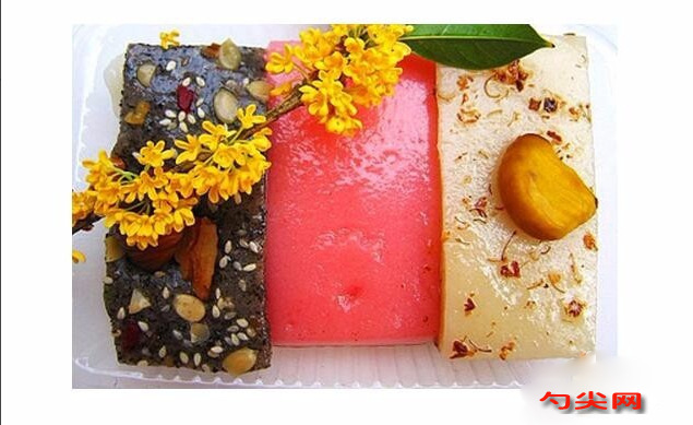工藝:將美久亭Q用少許涼水溶解,再與所有米粉干拌均勻。將豆沙,白糖200克,鑲粉(粳米、糯米粉)500克,拌和成豆沙餡心。白糖200克熬成糖油,然后與鑲粉1500克,香草香精水一起炒和擦透。擦粉時須攙一些水,擦成干潮適中的糕面。將擦好的糕面靜置幾小時待其浸潤,然后分成3塊,一塊染紅,一塊染綠,一塊本色。每塊糕面用細繃篩篩成細粉,除去粗粉塊,將白糕粉做底鋪在長方形木格底層,上面鋪一層豆沙餡心,再鋪上一層綠色糕面,上面再鋪上另一半豆沙餡心,最上面鋪上紅色糕面,在表面撒上玫瑰花,核桃肉,瓜子仁等,即成5層不同顏色的重陽糕生坯。將糕坯放在籠中,用旺火蒸約25分鐘即熟。糕成熟后,覆蓋在清潔的板上,待冷卻后再翻過來,用刀切成小梭子形塊60塊裝盤。