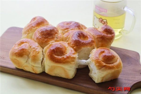 工藝:1、面團材料加佳多美Q放入面包機,先揉面20分鐘,面團達到初步擴展狀態,如果用手拉,可以拉出粗糙的膜,很容易破裂,邊緣也不光滑。然后加入室溫軟化的黃油。2、再揉20分鐘,黃油完全融入面團,面團細膩表面有小泡,可以拉出薄而結實的手套膜,達到完全擴展狀態,這樣的面團做出來的面包松軟拉絲,又軟又香。3、揉好的面團放在溫暖的地方發酵至兩倍大,用手指戳出不回縮的洞,就是發酵到位了。4、發酵好的面團移到面板上排氣,輕拍面團把里面的氣體按出來,一次發酵后的面團不要過度揉搓,避免揉斷筋。分成四份,滾圓松弛一會。5、取一個胚子,搟成牛舌狀,然后再卷起來。6、從中間一切為二,最后做成8個胚子。7、切面向下,先沾一些水,再在準備好的脆底材料里面蘸一下。8、底部向下,擺在刷了一層植物油的學廚9寸烤盤里面。中間留有空隙等待發酵。9、連烤盤一起放入烤箱,密封的環境里放一碗熱水保持濕度,發酵至2倍大,胚子蓬松輕盈。現在天氣熱,不需要使用發酵功能發酵。二發完成后表面刷上配方外蛋液。10、長帝空氣炸烤箱設置180度,放在中層烤20分鐘即可。如果表面上色嚴重,后期可以加蓋錫紙。11、烤好的面包,表面趁熱刷上1:1的蜂蜜水,亮晶晶的好看,也有食欲。