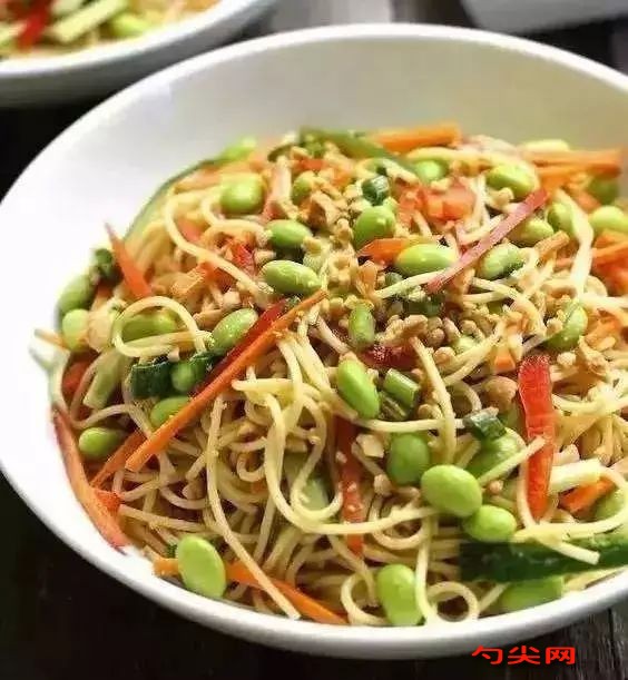 配方:鮮面條、黃瓜、胡蘿卜、彩椒、青豆、小蔥、姜末、蒜末、花生醬、花生碎、醬油、米醋、鹽、糖、香油,味達蕾901#3克