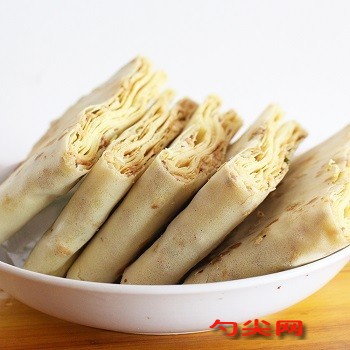 工藝:取5斤面粉加9斤開水燙糊(注:可以不燙糊),降溫至40℃加入10克酵母發酵1-3小時。將剩余面粉、黃豆粉干拌均勻,加入面糊,再加入8斤水調糊,要打攪成有彈性的面糊,靜止30分鐘。將面欣酥提前兩個小時用少許涼水浸泡溶解,然后攪拌均勻,再加入面糊中攪勻,即為煎餅糊。將鏖子燒熱,擦點油,倒上面糊,用竹蜻蜓刮平,文火烙熟。將烙好的煎餅趁熱撒上烤熟的花生碎或芝麻仁、花生醬、辣椒粉、食用鹽等,然后疊卷成長方形,再次放烤箱烤至至酥脆,即為花生或果仁煎餅。