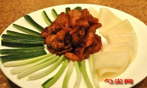 配方:去皮五花肉(肥七瘦三)400克。調(diào)料:食用堿5克,南乳汁20克,花生醬10克,料酒10克,面粉15克,生粉15克,鹽5克,味精3克,色拉油1000克,蔥絲10克,春卷餅10張,熟甜面醬20克,味達(dá)蕾901#4克。