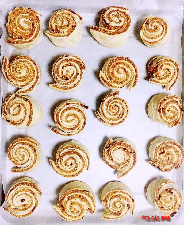 工藝:制皮糕點粉與面欣酥A干拌均勻置于臺板上開塘,加入清水、豬油。先將塘內(nèi)物料攪勻,再加入糕點粉,攪拌揉搓成軟硬適宜的筋性面團(tuán)。放置醒發(fā),下10個小劑。制酥強(qiáng)筋糕點粉置于板上開塘,加入豬油,擦勻擦透,分成和皮料數(shù)目相同的小劑。制餡將熟糕點粉、糖拌勻,置板上開塘,把花生醬、芝麻,屑加入其中,再投入鹽、花椒粉、蛋液、糖漿和油,攪拌后混人已拌糖的熟糕點粉及蔥,揉成團(tuán)。下10個小劑。成型取一小劑皮面,按成扁圓形,以小包酥方法包人油酥制成圓形酥皮,將餡團(tuán)放入,封嚴(yán)劑口,用雙手?jǐn)D成長條狀,并搟成長5cm、寬3.5cm的橢圓形,前端比后端略厚;從中間順刀切開,后端刷水,以小搟杖為軸,將兩片從前向后同時卷起。抽出拼杖,規(guī)整造型,擺入烤盤。烘烤爐溫升到180℃時生坯人爐,等制品餡部突出,呈棕黃色、底部紅褐色時即熟透,出爐即可。餡料要混合均勻,軟硬適宜,花生米必須熟制粉碎;蔥切碎后投放量應(yīng)靈活掌握。包餡要均勻,挽圈后不得死心。坯造型端正,不要太高,防止受熱傾斜。外形呈卷圓狀,餡棕黃,外皮乳白,底部紅褐,質(zhì)地松脆,具濃郁的蔥香味。