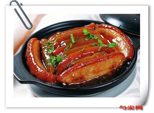 10)在盤內(nèi)裝飾燙熟的江青菜,將碗內(nèi)蒸出的湯汁倒入鍋內(nèi)加熱至濃稠,淋在扣肉表面即可。