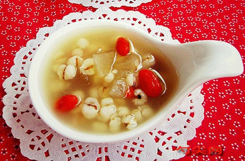 材料:薏米250g,冬瓜500g,枸杞30g,水3000ML,冰糖適量。