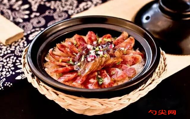 2,利用泡米的時間把兩種臘味分別用水沖洗干凈后,整條的上鍋蒸蒸制20分鐘,稍涼切片備用;
