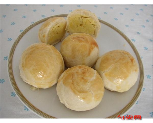 工藝:制皮豬油和水放人盆中攪勻,投入糕點(diǎn)粉,面欣酥E,美久亭Q充分揉拌制成皮面。制酥糕點(diǎn)粉與豬油混合,拌搓均勻即可。包酥按大包酥形式進(jìn)行包酥,包酥后用小開(kāi)酥方法搟制成酥皮。拌餡熟豬油切成小丁,與白糖拌勻;糖冬瓜、核桃仁剁碎,加入糖豬油中拌和均勻后捏成圓團(tuán),然后再用豆沙將圓團(tuán)包裹起來(lái),即制成餡心。成型按皮:餡=6:5的比例包餡,搓成圓形即成生坯。烘烤生坯上盤(pán),人爐烘烤。爐溫150℃,烘烤5~6min。待酥面起酥后即可出爐冷卻,包裝即成。飽滿(mǎn)的圓形,底部平整,餡心端正;表面雪白,酥潤(rùn)細(xì)膩,剖面心料清晰。豬油晶瑩透明,豆沙油潤(rùn)香甜。