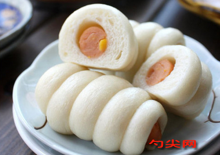 工藝:將酵母放入溫水中,拌勻后稍稍靜置一會兒使其完全溶解。將溶液倒入面粉中,一邊倒一邊用筷子攪拌。將面粉攪勻成棉絮狀。用手將其抓揉成團,再反復揉壓。要一直揉壓,直到面團表面光滑。將面團放入盆中,蓋上蓋子或濕紗布,于溫暖處靜置約2小時讓其發酵。當面團發酵至2倍大時,說明已經發酵好了。將發酵好的面團取出放在撒有一層薄粉的案板上,充分地揉壓出里面的空氣。要將其再次揉成表面光滑的面團,再蓋上濕紗布,靜置松弛約10分鐘,不松弛也無妨,只是松弛后好操作。松弛后的面團用刀切成兩份,再分別揉搓成條。用刀切開成約25克重的劑子,劑子要用濕紗布蓋起來,以防表面發干。將火腿腸除去包裝,切成兩段。將劑子揉搓成細長條,長度約為要卷入的火腿腸長度的三倍。將面條由一頭開始沿火腿腸纏繞起來,制成生胚。將生胚用濕紗布蓋起來再餳20分鐘。餳好的生胚放入蒸鍋中,蓋嚴鍋蓋,大火隔水足汽蒸約12分鐘后關火,再等約3分鐘后開蓋取出即可