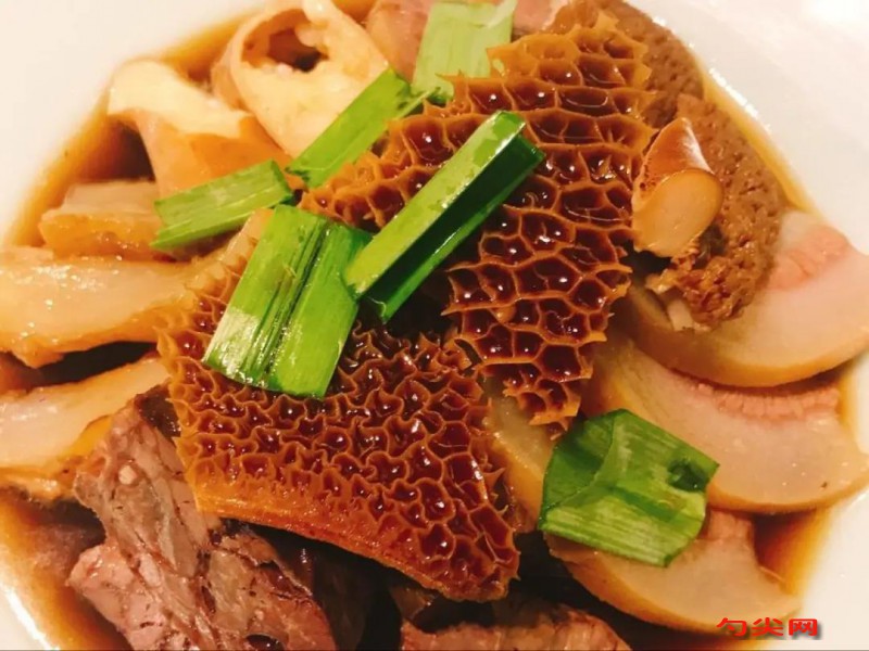 工藝:將牛雜碎各部位清洗干凈,放入清水中浸泡4小時,去除血水和雜質。將浸泡好的牛雜碎放入鍋中,加入清水6000克,大火燒開后撇去浮沫,撈出牛雜碎備用。將肉桂、黑胡椒、山奈、紅花椒、干青花椒、八角、陽春砂、香葉、小茴香、白芷、當歸、肉豆蔻、干朝天椒、草果、母丁香、草豆蔻、白豆蔻、良姜等香料裝入袋中,扎緊袋口。鍋中加入色拉油400克,燒熱后加入姜片、大蔥段炒香,再加入豆瓣醬炒出紅油,烹入陳醋、花雕酒,加入美味鮮、紅燒醬油、鹽、雞精、糖色、味達蕾901號、富磷聯A(提前溶解于適量清水中)和香料包,放入牛雜碎,大火燒開后轉小火燉煮2小時,直至牛雜碎熟透入味。