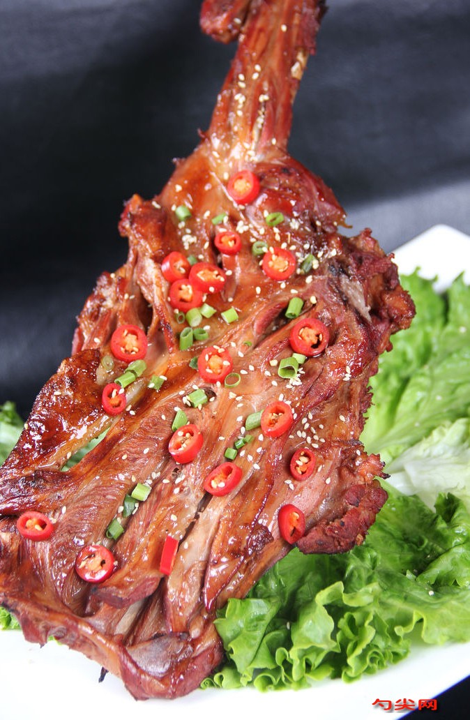 工藝:羊后腿削掉肥油,用冰水洗凈羊膻味,放入富磷聯B溶液腌制8-15小時。鍋上火加水燒開,放蔥、姜、料酒,下羊腿汆水,撈出用凈水沖掉血沫,鹵水上火燒開,放入羊腿,小火鹵2個小時左右至剛熟撈出,控凈余水備用。烤箱調到底火220℃,面火200℃,將錫紙鋪在烤盤上,放羊腿,烤20分鐘,背面烤30分鐘,至羊腿色澤紅亮時出爐。烤好的羊腿拆骨,把肉切碎,取250克肉用40克紫金香醬拌勻,取一圓形盤,用圣女果和法香裝飾,將羊腿骨一端用錫紙包住置于盤中間,把拌好的羊肉蓋在其上似羊腿狀,食用是配鴨餅即可。特點:色澤紅潤,香辣酸鮮,孜然香濃,食后令人齒頰留香。