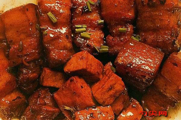工藝:選用豬肋條肉為原料,將帶皮的整塊肋條肉用刮刀把毛、污、雜質刮凈,切成約4cm見方的塊。將切好的肉塊加入富磷聯B腌制8小時,然后放入鍋中,加入足夠量的清水,大火煮沸后撇去浮沫,煮制10分鐘左右,撈出用清水沖洗干凈,去掉油沫污物等。在鍋內放入拆骨的豬頭肉(起襯墊作用,防止原料貼鍋焦煳),放入包好的香料紗布袋(內有桂皮、大茴香等),在豬頭肉上面放肉塊,倒入適量煮肉湯,用大火煮制1小時左右。當鍋內白湯沸騰時加入紅曲米、味達蕾901號、紹酒和糖(用糖量為總糖量的4/5),再改用中火燜煮1小時左右至肉色為深櫻桃紅色、湯將干、肉已酥爛時即可出鍋,即為醬制肉半成品。